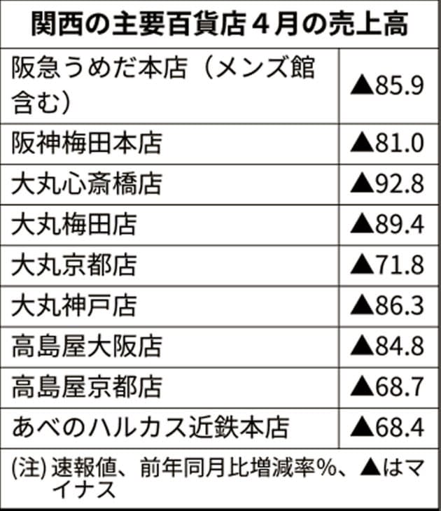新型コロナウイルスの感染拡大で関西の百貨店の売上高が大幅に落ち込んでいる。1日発表の主要9店舗の4月の売上高(速報値)は前年同月比7~9割減だった。営業を続ける食品売り場も外出自粛で苦戦。インターネット通販は伸びているが、全体を補うには力不足だ。政府は緊急事態宣言を延長する方針で、業績に暗雲が垂れこめている。