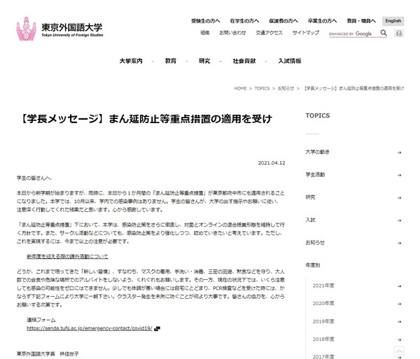 東京外国語大学は4月12日、大学のある東京都府中市にも「まん延防止等重点措置」が適用されたことから、Webサイトに学生に向けたメッセージを掲載した。同大学では、2020年10月以来、学内での感染事例はなく、大学の出す指示などに従い、注意深く行動してくれた結果だと感謝を述べている。今後は、感染防止策をさらに徹底し、対面とオンラインの混合授業形態を維持する方針。三密の回避、黙食などを守り、大人数での会食や危険な場所でのアルバイトをしないよう促す。また、少しでも体調が悪い場合には自宅にとどまり、PCR検査などを受けたときには、必ず大学に一報し、クラスター発生を未然に防ぐことが大事だとしている。