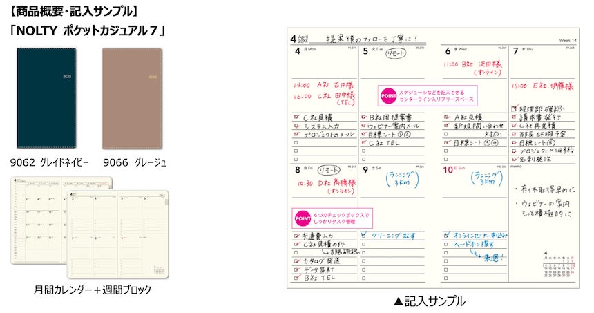 コロナ禍によるワークスタイルの変化で在宅勤務など働き方が多様化したことにより、高いレベルでの自己管理力が必要となった昨今。そういったニーズに対応し、タスク管理に特化したレイアウト「週間ブロック」タイプのラインナップを拡充しました。1月始まり版でも好評だった「週間ブロック」タイプですが、4月始まり版ではコンパクトサイズの「NOLTY ポケットカジュアル7」と、たっぷり書けるB6サイズの「NOLTY エクリB6-8」が新商品として登場します。
