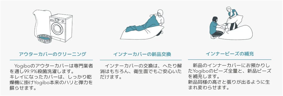 リペアサービスとは、お客様ご愛用のYogibo を新品のようにお手入れするサービスです。アウターカバーの洗濯・乾燥はもちろん、ご自宅でのメンテナンスでは出来ないインナーカバーの新品交換、ビーズの補充などYogiboのお手入れを全てお任せいただけます。より丁寧に、完璧に、責任をもって、大切なYogiboをメンテナンスいたします。